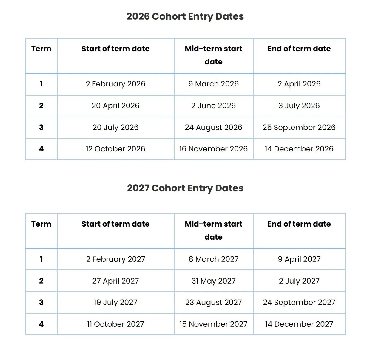 The entry dates for 2026 and 2027 are: